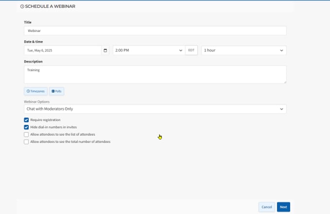 Schedule your meeting in advance and add a poll that can be initiated and/or edited at any time during the live meeting.