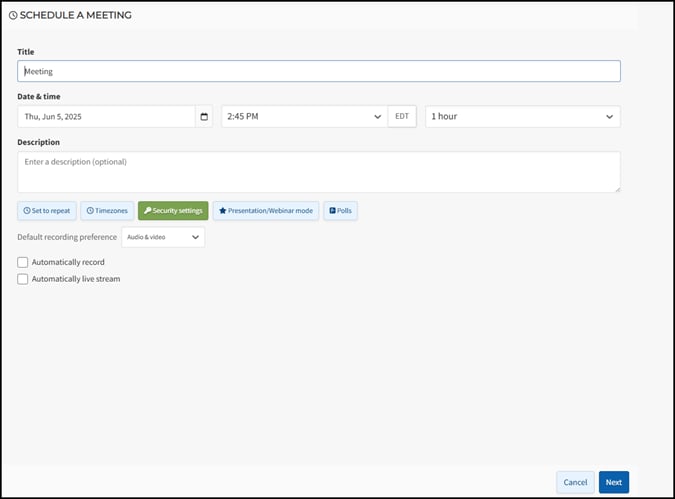 7. Security settings-Create a randomly generated one-time access code or add a meeting passcode.