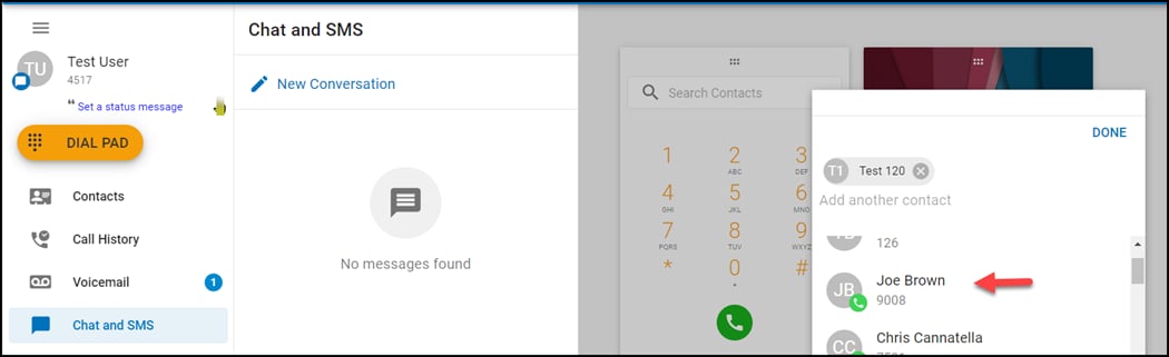 Clicking on the call history entry will return the call, chat with another user, send an SMS if enabled. Create a new contact or add to an existing contact.