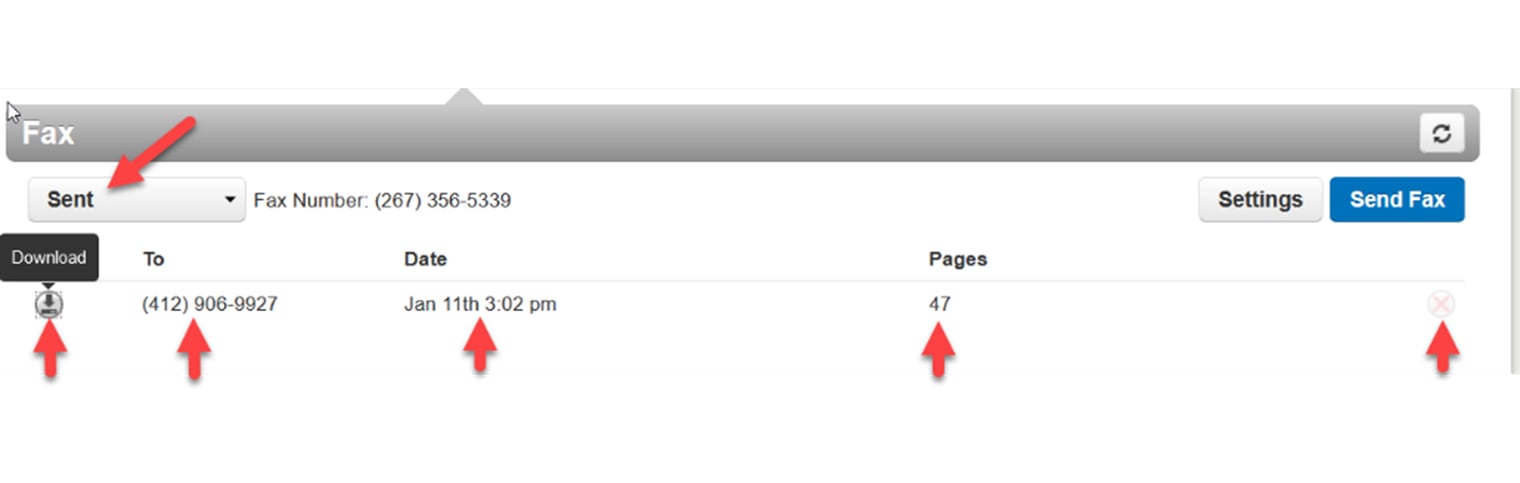 The Sent folder will show the fax number, date the fax was sent and the number of pages.
