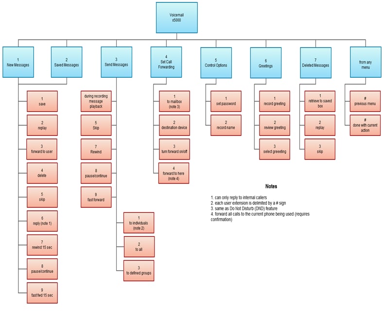 On the next page youʼll find a voicemail tree showing what to dial for each option in your mailbox.